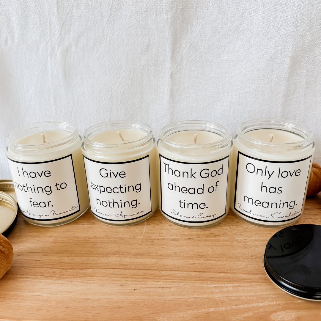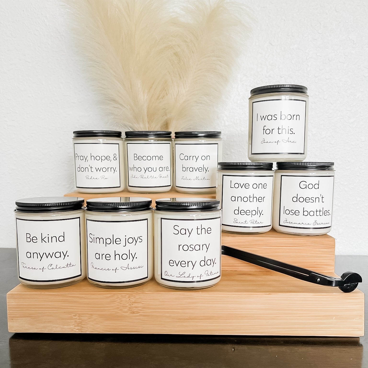 The Saints are on our side, constantly praying and cheering us on as we strive for Heaven. Our goal is to share the love of God and the encouragement these heavenly friends with everyone. Sword & Crown candles are the perfect daily reminders of the wisdom, example, and intercession of all of the holy men and women who have walked the road before us and now enjoy eternal glory. Read more about our mission: